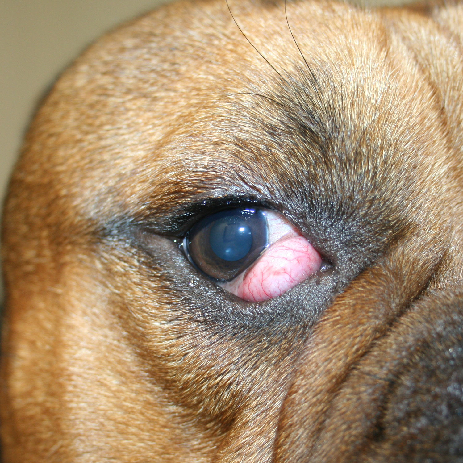 Ook bekend onder de term cherry eye. Dit is een verzakking van het traanvocht producerende kliertje. Je herkent het als een zwelling in de ooghoek die hinderlijk voor het dier kan zijn.